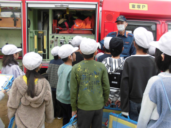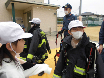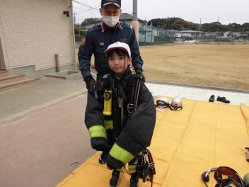 ポンプ車を見たり、実際に防火衣を着て酸素ボンベを背負ったりしました。「これを着て、火を消すための道具を持って階段を走ったりするんだよ。」と説明があったときは「私には絶対無理だ。」と子供たちは驚いていました。