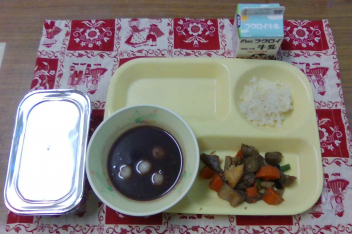 • ごはん、牛乳、いりどり、だいこんの浅づけ、おしるこでした。