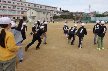 学年全体を4つのチームに分け、リレーを行いました。