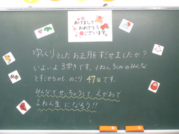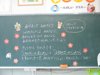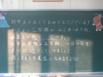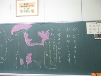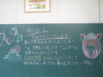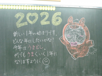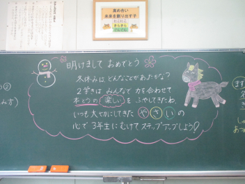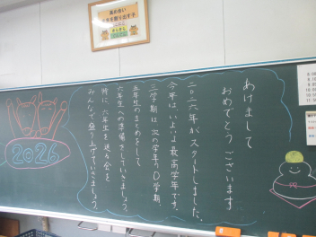 ついに今日から3学期が始まりました。 久しぶりに登校した教室で、真っ先に目に飛び込んできたのは、黒板いっぱいに描かれた鮮やかなイラストと先生からのメッセージでした。冬休み中、静かだったであろう教室で、先生が一人ひとりの顔を思い浮かべながらメッセージを書いている姿を想像して、なんだか胸がいっぱいに…。