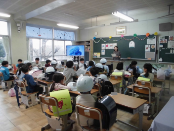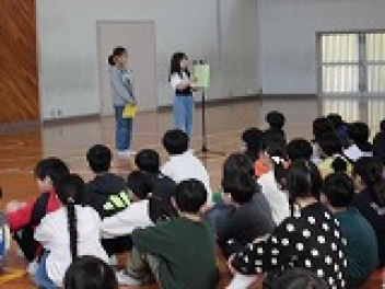 次に始業式が始まりました。校長先生のお話の後に、児童代表の言葉があり、これからの決意が述べられました。その後、担任の先生の発表がありました。子供たちのわくわくしたまなざしが見られました。
