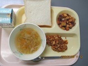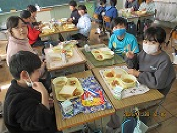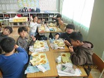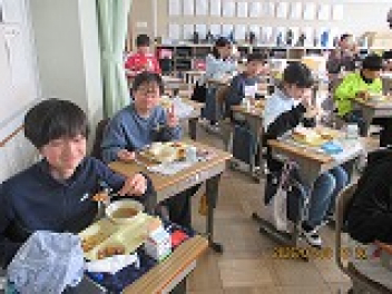 久しぶりの給食で、それぞれの学級では笑顔があふれていました。今日のメニューは、「牛乳」「食パン」「チリコンカーン」「ジュリエンヌスープ」「キャラメルポテト」でした。