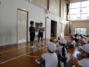 今回は1組の児童が司会進行を行いました。種目はドッジボールとけいどろです。