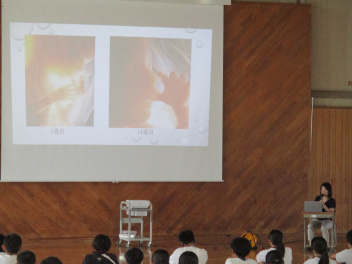 産婦人科の先生を講師にお迎えして、「ティーンのこころと体と未来を守るために」をテーマにお話をしていただきました。思春期真っ只中の今、性に関して興味を持つことや性に関する悩みがあることは、決しておかしなことではありません。様々な画像を見ながら、性に関する正しい知識や命の大切さについて自分事として学ぶことができました。