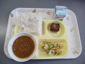 今日は久しぶりのソフトめんでした。ソフトめんとひき肉がたっぷり入ったみそカレーソースを絡めて、カレーの風味を味わいながらおいしくいただきました。食べ頃の時期を迎えたさつまいもは、食べ応えのある大きさで、甘さもしっかりと感じられました。