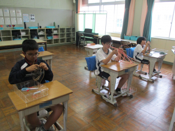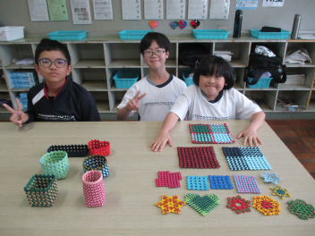 5組の生徒がクラフトバンドで作った作品です。(写真では、ほんの一部を紹介します)