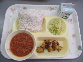 ソフトめん  牛乳  ミートソース  フレンチサラダ  大学いも