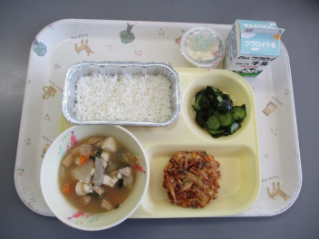 今日は久しぶりのソフトめんでした。めんを定番のミートソースに絡めて、体操服にソースが飛ばないように気をつけながら、おいしくいただきました。
