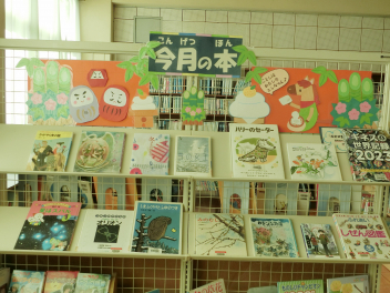 午年やだるま市をを思い浮かべられる掲示と季節に合わせた本が展示されています。