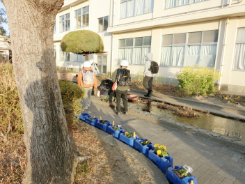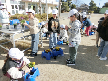 1学期に野菜を育てた2年生は春に向けてパンジーの苗を植木鉢に植えました。