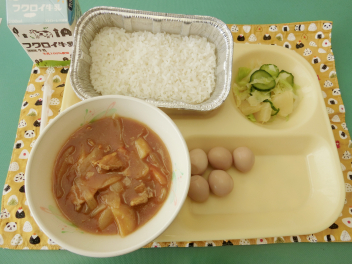 今日の給食は、昔から大人気のポークカレーとしょう油卵、パインサラダでした。