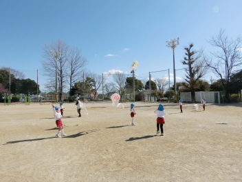 豊西幼稚園の園児さんが運動場で凧揚げをしていました。