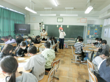 昇降口でお迎えをして、1組2組に分かれて始めの会をしました。