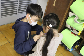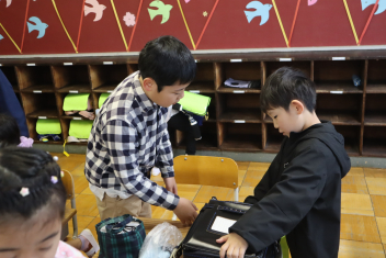 昇降口や教室で声を掛け、朝の支度を手伝っていました。