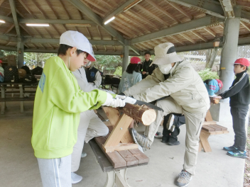 ボルダリング、秘密基地、葉っぱ探し、カニ取り、丸太切りとミッションに挑戦しました。
