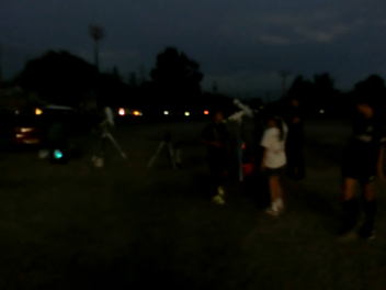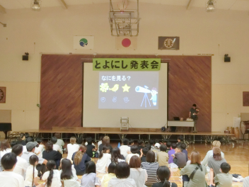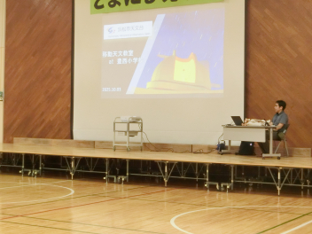 体育館で浜松市天文台の職員の方に「星空の話」を聞いた後、実際に望遠鏡をのぞいて観察をしました。