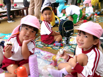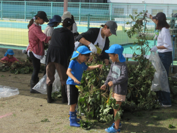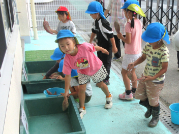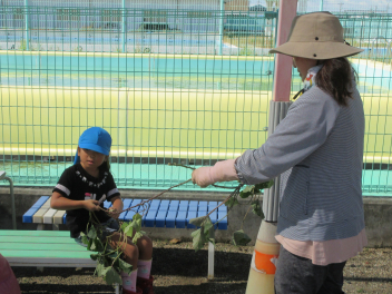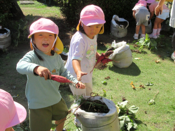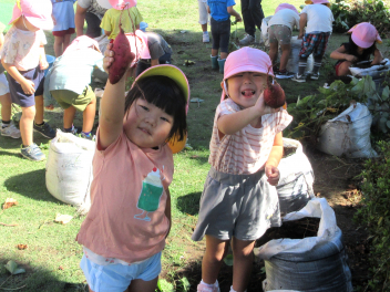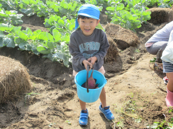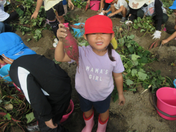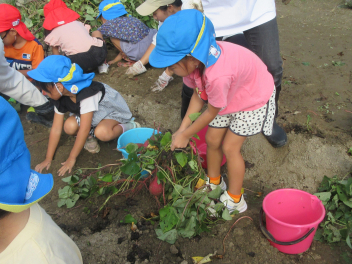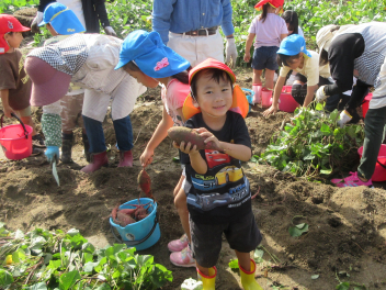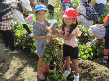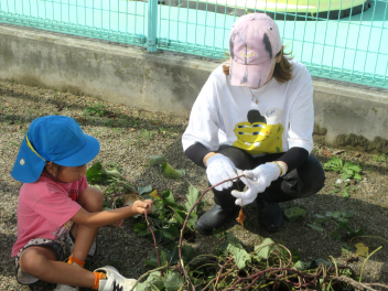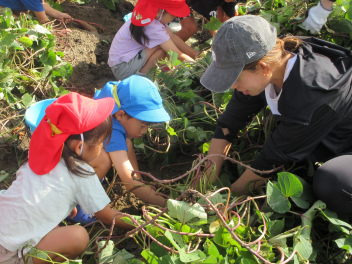 秋は、「食欲の秋」「実りの秋」というように、お米やマツタケ、栗、秋刀魚などおいしいものがたくさん採れます。豊西幼稚園では、今日、サツマイモの収穫をしました。