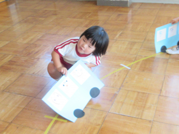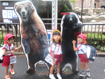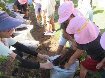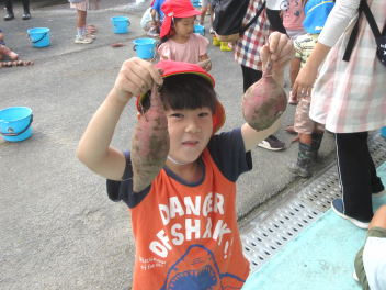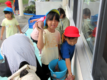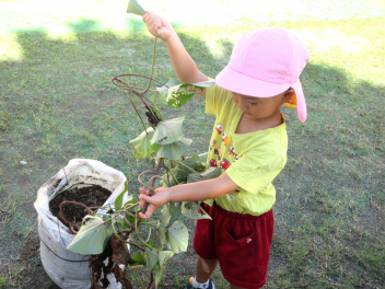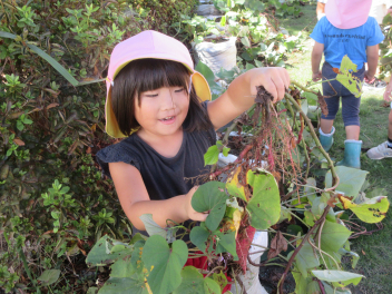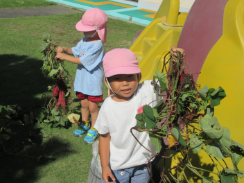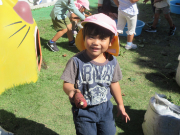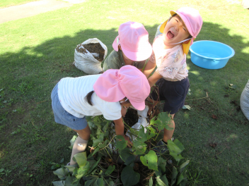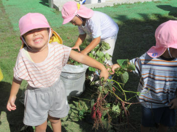うさぎ組さんは、畑ではなく、土嚢袋で育てたサツマイモの収穫です。やっぱり、「うんとこしょ、どっこいしょ」という掛け声で力を合わせています。