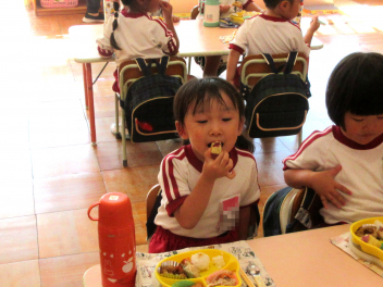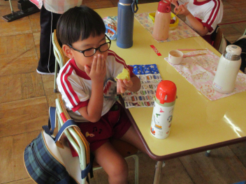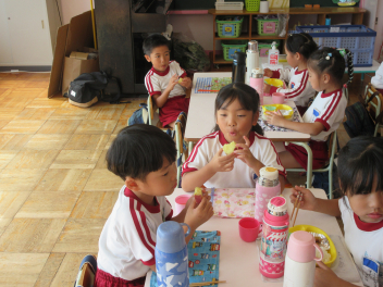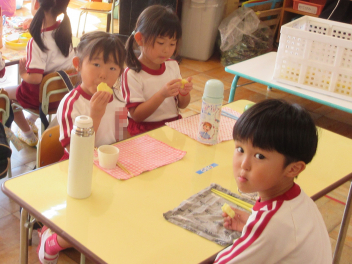 お昼には、収穫したサツマイモを蒸かして、みんなで食べました。自分たちの手で掘ったサツマイモの味は、格別だったようです。