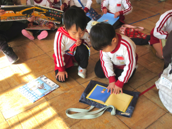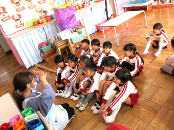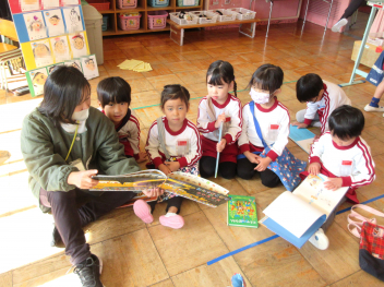 ちなみに、知っている方いらっしゃるかもしれませんが、遊戯室のステージの壁紙が一新されています。そのお披露目というわけではありませんが、雰囲気の変わった遊戯室でのお話会です。ただ、前の色とほとんど変わっていないので、実は気付いている園児はごくわずかです。