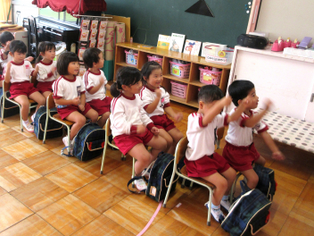 うさぎ組さんは、折り紙を使ってお弁当づくりをしました。その後、バスの席ように並んで、「バスごっこ」「バスに乗って」などを歌い踊って、一足早く遠足気分を味わっていました。