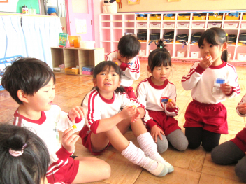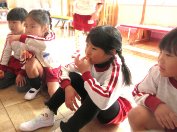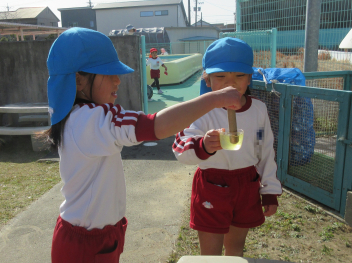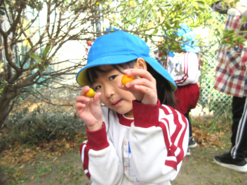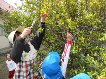 豊西幼稚園の裏庭には、「きんかん」の木があります。今日は、そら組さんが「きんかん」を収穫し、味わっていました。そのまま食べると、苦さと酸っぱさで顔をしかめる子も。「きんかん」は、大人の味と言えるかもしれません。