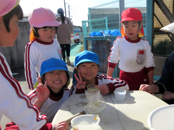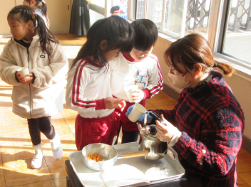 シロップで煮て、再チャレンジをすると、ほとんどの子が食べることができました。食べた後のシロップは、お湯を足してもう一度味わいました。