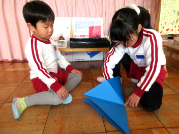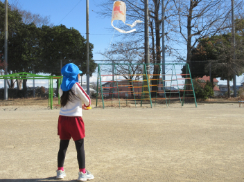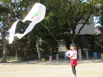 本日は、風が強すぎたためか、「凧」はくるくると回ってしまい、がなかなかうまく揚がりませんでした。園児たちからは、「大人はどうして揚がるの?」という声が聞かれました。終了時には、「もう一回やりたい」と口々に言っていました。