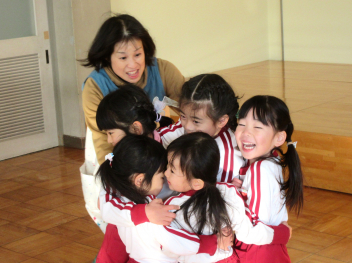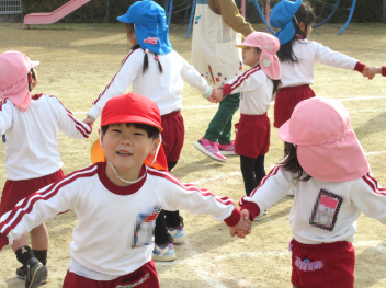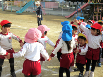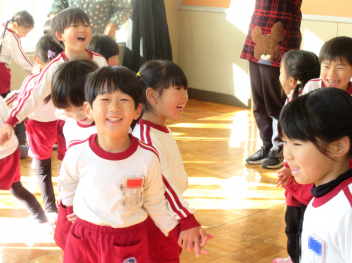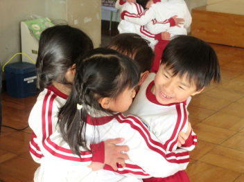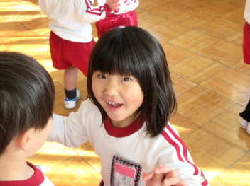 今週から、「なかよしタイム」が始まっています。「あったかマラソン」を走り終えた後に、年長・年中・年少が混合した「なかよしグループ」で活動します。まだあまり話したことのない子もいるので、緊張を和らげ、コミュニケーションを円滑にするためのアイスブレイクとして、『なべなべそこぬけ』をしています。