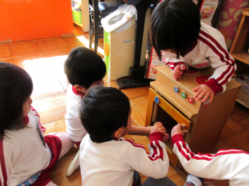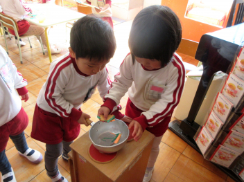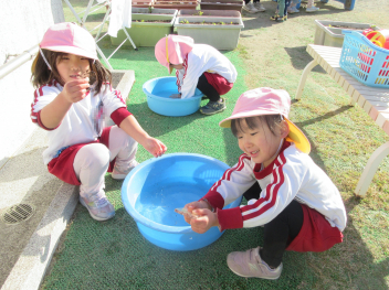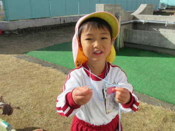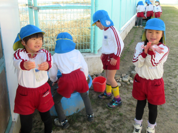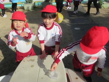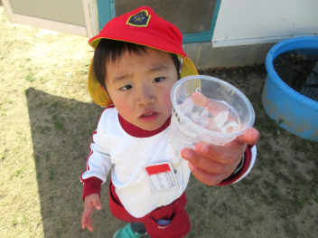 •  今日は、ここ数日の中では少し暖かく過ごしやすい一日でした。でも、やっぱり寒い。そら組さんがメダカのいるミニビオトープ(たらい)に氷が張っているのを見つけると、ばら組さんも、うさぎ組さんも園内にある氷を探し出します。みんな笑顔です。