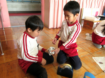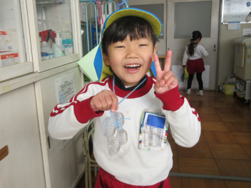 氷を息で溶かして穴をあけ、メダルを製作しました。それを、うさぎ組さんにプレゼントとしています。みんな嬉しそうです。