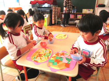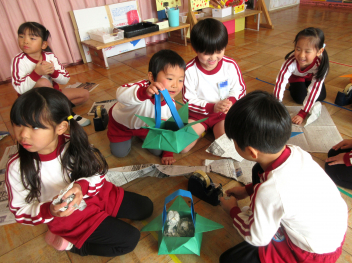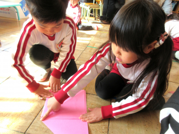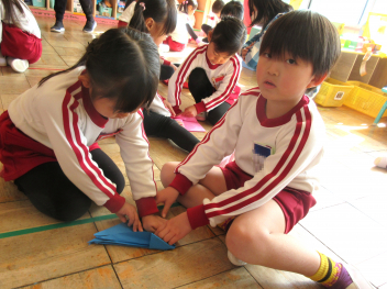 なかよしグループでペアを作って、二人で協力して製作しました。そら組さんがばら組さんに教える姿は微笑ましく、また頼もしく見えました。