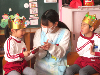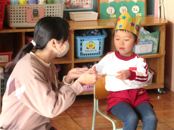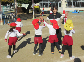 「なかよしタイム」は、いつものクラスの仲間とはメンバーが異なるため、不安を感じる園児もいるようです。人と関わることも大切な力ですので、楽しいゲームで抵抗感を軽減して、コミュニケーションが図れるよう計画しています。