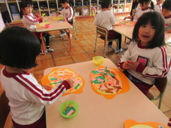 今日は、うさぎ組さんが「シチュー」を製作しました。実際にシチューをつくるのではなく、画用紙で作るシチューです。様々な色の画用紙を具に見立て、はさみで切り、糊で貼り付ける学習です。みんな真剣に取り組んでいました。でき上がったシチューを嬉しそうに職員室に持ってきましたよ。