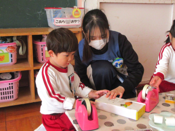 なかよしグループでペアを作って、二人で協力して製作しました。そら組さんがばら組さんに教える姿は微笑ましく、また頼もしく見えました。