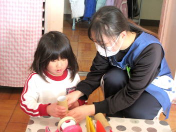 「なかよしタイム」は、いつものクラスの仲間とはメンバーが異なるため、不安を感じる園児もいるようです。人と関わることも大切な力ですので、楽しいゲームで抵抗感を軽減して、コミュニケーションが図れるよう計画しています。