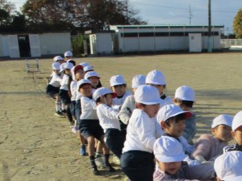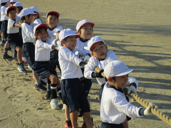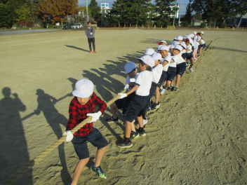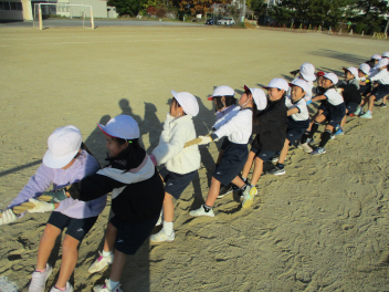 4組が中心で学年集会を行いました。クラスごとに協力して綱引きを行いました。