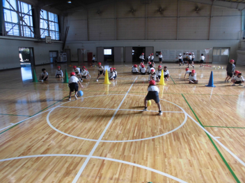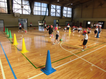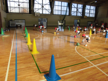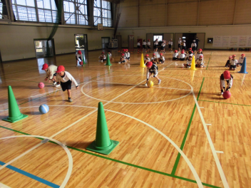 体育の授業では、ボールなど道具を使った遊びを行いました。