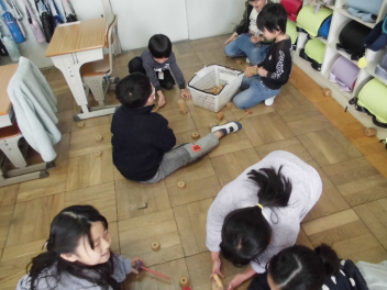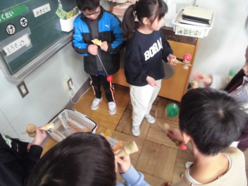• 1年生は、生活科で昔の遊びについて学習しました。