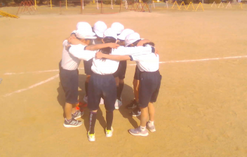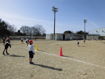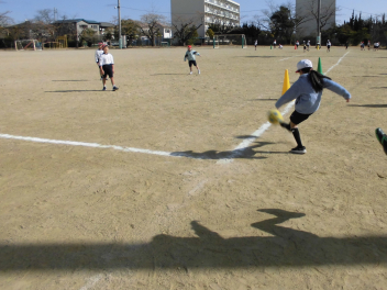体育科の学習で「キックベースボール」を行いました。チームで円陣を組んだり声を掛け合って協力したりして、楽しく活動しました。