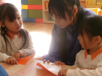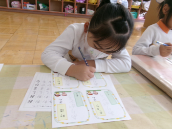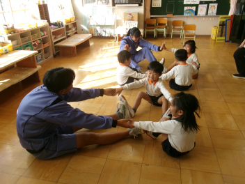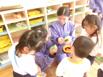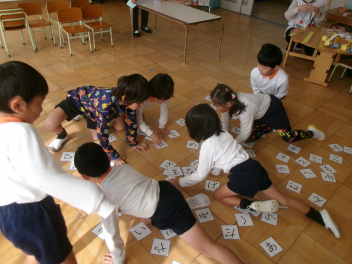 始めの会が終わると、もっと仲良くなるために、「ともだちできちゃった」の触れ合い遊びを楽しみました。年少さんは、先ずはみんなでドングリプールやブロックなどで遊びながら仲良しになりました。