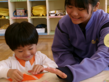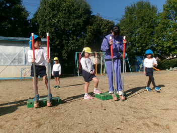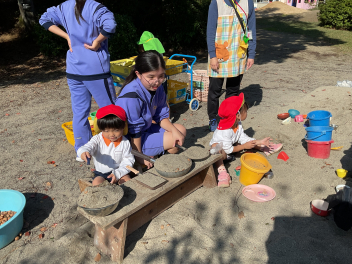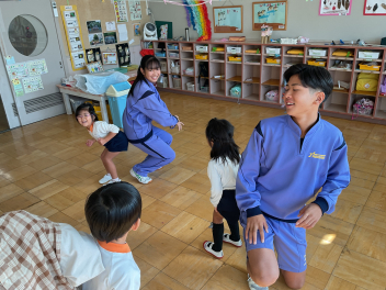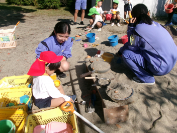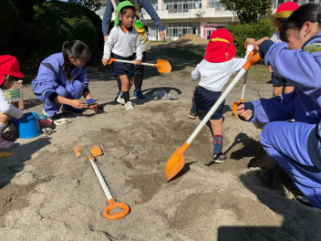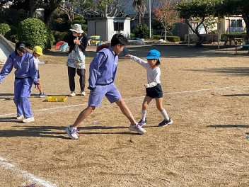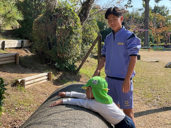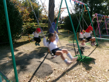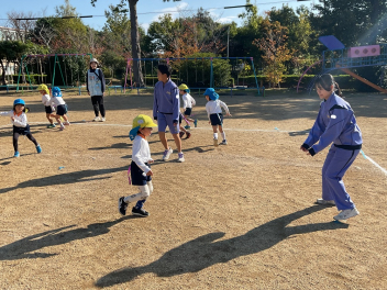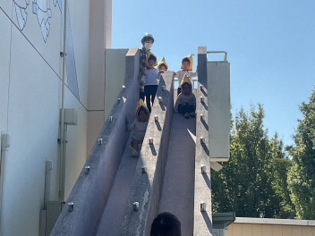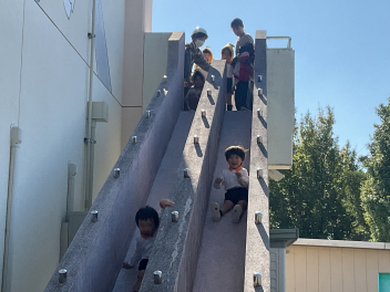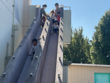 ブランコなどの遊具はもちろん人気ですが、やはり築山の滑り台は大人気!他園の子たちが集まって、恐る恐るですが何回も滑っていました。年長さんは集団遊びも好きで、いつもより大勢でしっぽ取りとリレーをたくさん楽しみました。