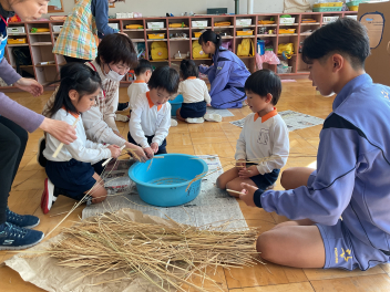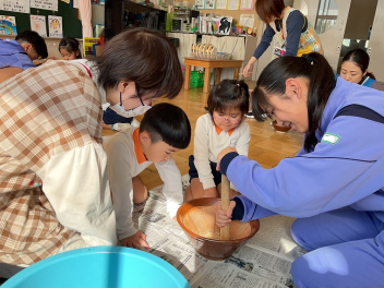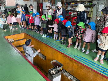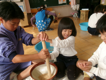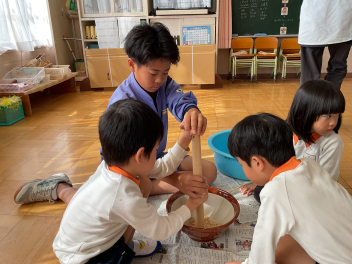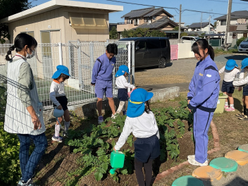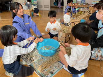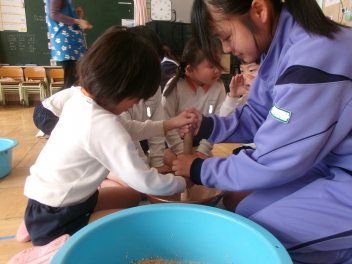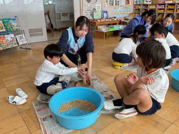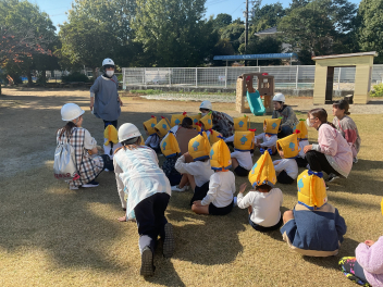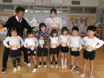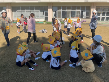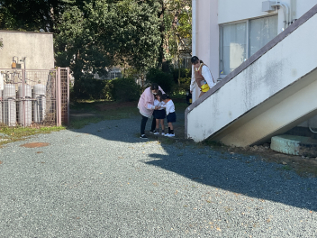 目をキラキラさせていたのは、よいこの森一杯に落ちていたドングリ(クヌギ)。子供たちも先生方も夢中になって拾っていました。いつもたらい一杯にドングリを集め、いろいろな遊びをしている豊岡の子は幸せだなと感じました。