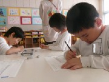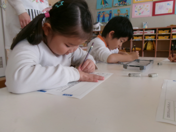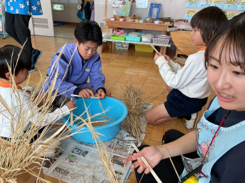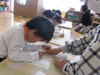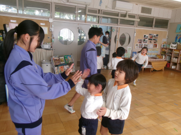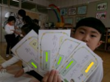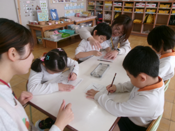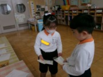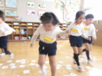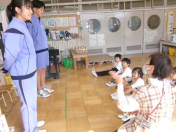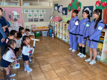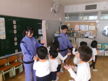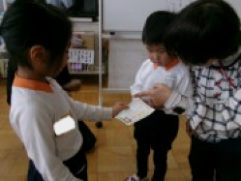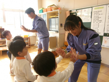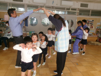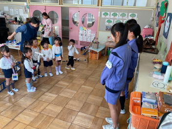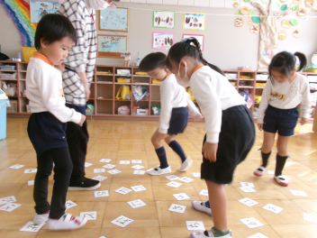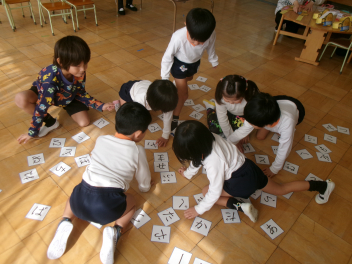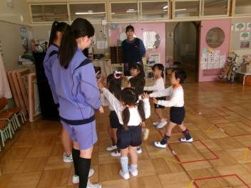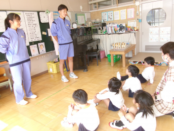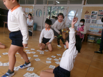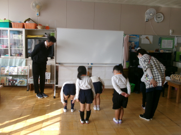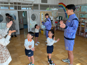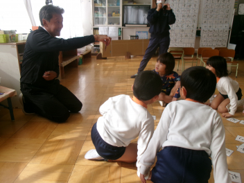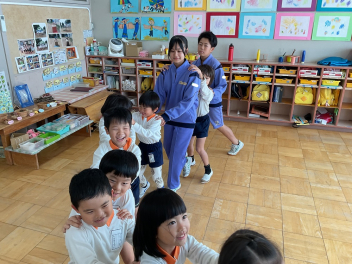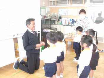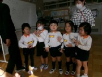 三園合わせると50人近くで年少さんも一緒。今回は各学年に合わせて、各学年の保育室で、始めの会を行うことにしました。元気よく挨拶をして交流がスタート!豊岡幼稚園の子たちは、園のことや遊び紹介をしました。