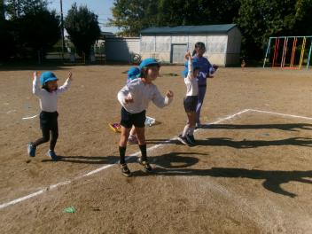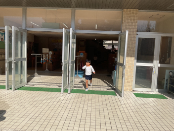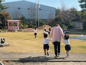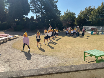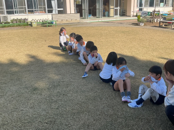 いよいよ外に出て園庭で遊ぶ時間。芝生広場でゴロゴロしながら遊ぶ子。南園庭の遊具や築山で遊ぶ子。しっぽ取りやリレー遊びの場所で、好きな遊びをする子など、園庭が少し狭く感じられるほど、走り回る子ども達でいっぱいになりました。