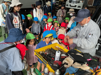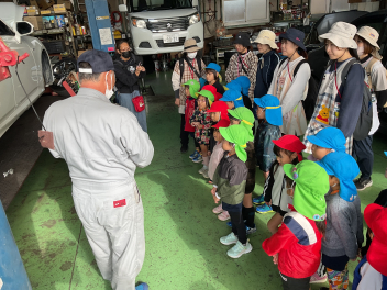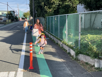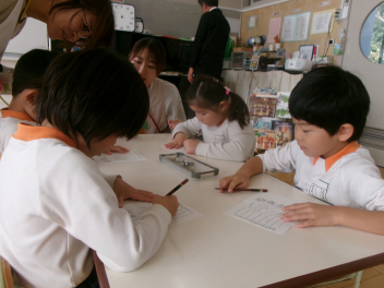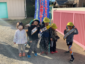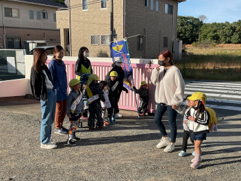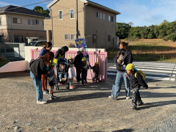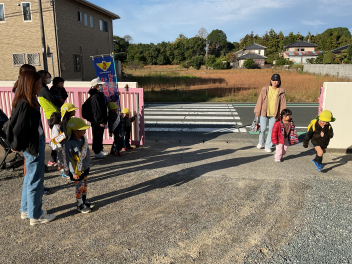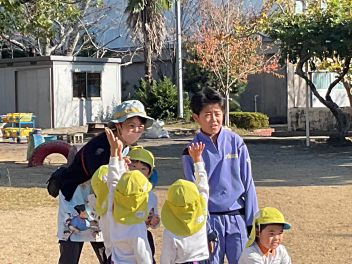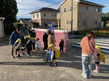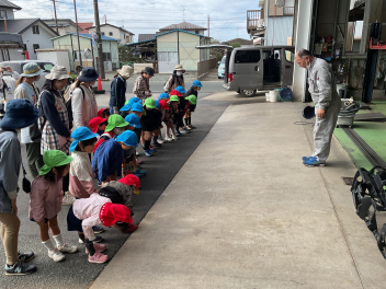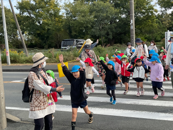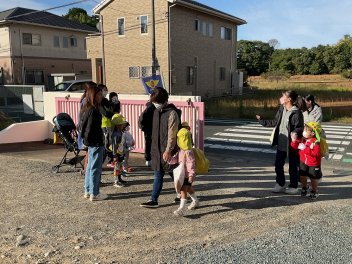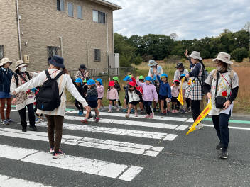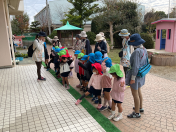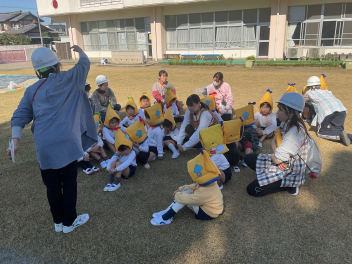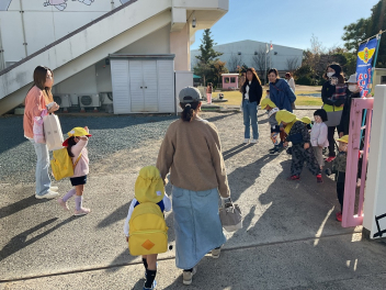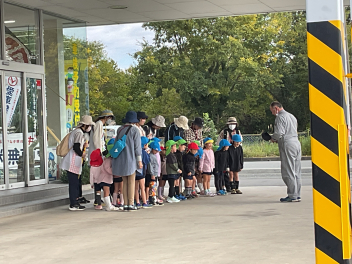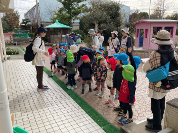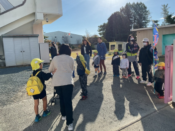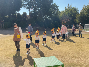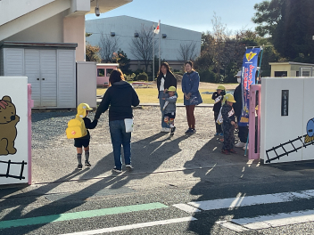 昨年度までは、花川幼と三方原幼との三園でしたが、本年度は花川幼に代わって初生幼との三園で交流しています。ドングリが一杯ある豊岡幼稚園は、秋の第2回を担当。三方原幼は小型バスで園に。初生幼は、保護者の送迎で駐車場から歩いて園に到着しました。