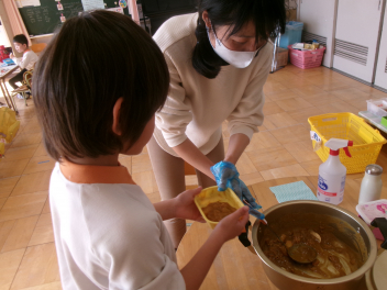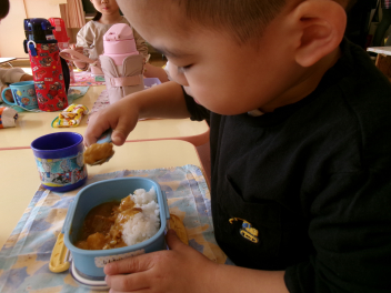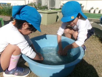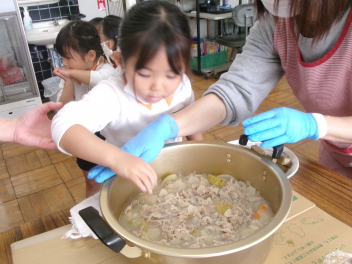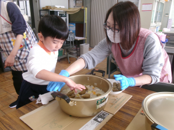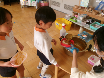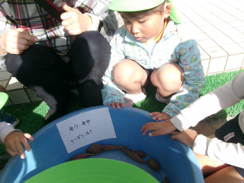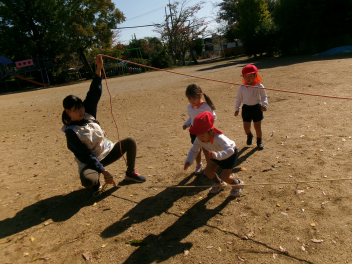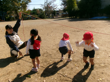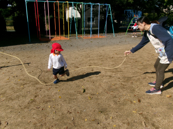 トトロの「さんぽ」など、子供たちが良く知っている曲を次々に演奏してくれました。色々な楽器が集まると、すごく素敵な音になりましたね。後半では、「おべんとうばこ」「グーチョキパー」などの手遊び歌を教えてくださり、演奏に合わせて遊びました。