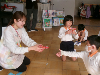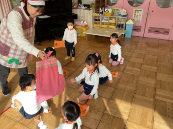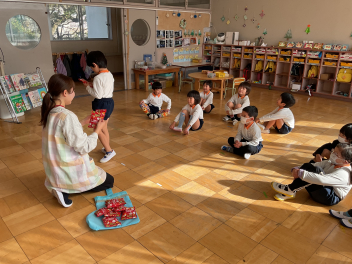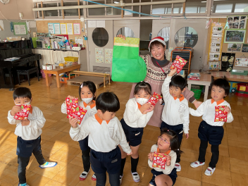 ゲームが終わると毎年恒例の「お礼の肩たたき」。シニアの会の皆様は、みなさん素敵な笑顔で子供たちの肩たたきを受けていらっしゃいました。最後に挨拶をし、ハイタッチをして終了。何だか参加した皆が幸せな気持ちなれた素敵な時間でした。年少さんも頑張って歩いて帰り、園務員さんに「ただいま」の挨拶をしました。今日のご褒美は、「三ケ日みかん」でした。美味しかったね!
