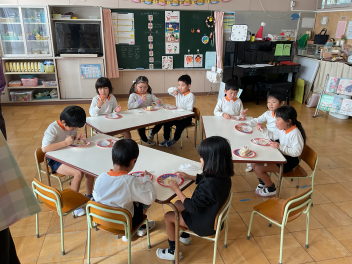 いよいよ、各学級で配膳。部屋中にご飯の香りと、おでんの匂いが充満!いただきますをすると、「もー!がまんできない!」とみんなパクパクとおにぎりにかじりつきました。大根におでんのつゆが良くしみ込んでいて、本当に美味しかったですね。おにぎりはほぼ全員がお替りをし、年長さんの中にはおにぎりを4個食べた子がいたそうです。おでんも完食!みんなご大満足の収穫祭となりました。自分でつくった物って何であんなに美味しいのでしょうね!?