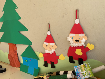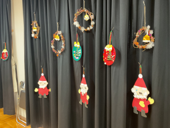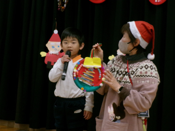 続いてクリスマスの飾りもそれぞれの学年で作りました。年長さんは、ミニ発表会の時のひまわりぐみさんへのプレゼントも作成してくれましたね!各学年の代表1人ずつ、サンタさんが来る前に、製作で頑張ったところなどの発表をしてくれました。